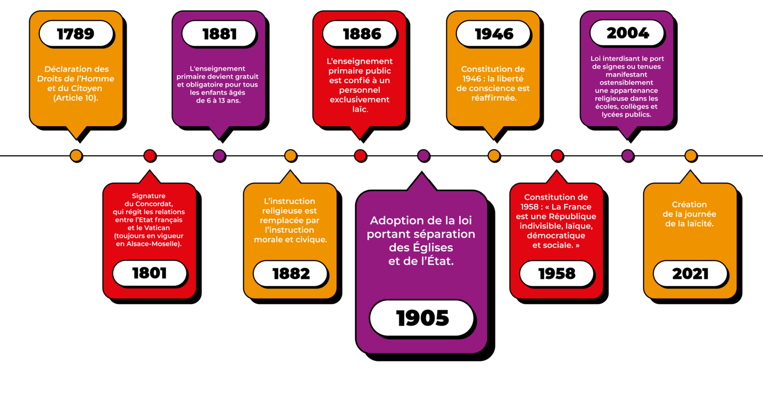 Dès la Révolution française, l’idée d’un état laïque se dessine au travers de la Déclaration des Droits de l’Homme et du Citoyen qui stipule que