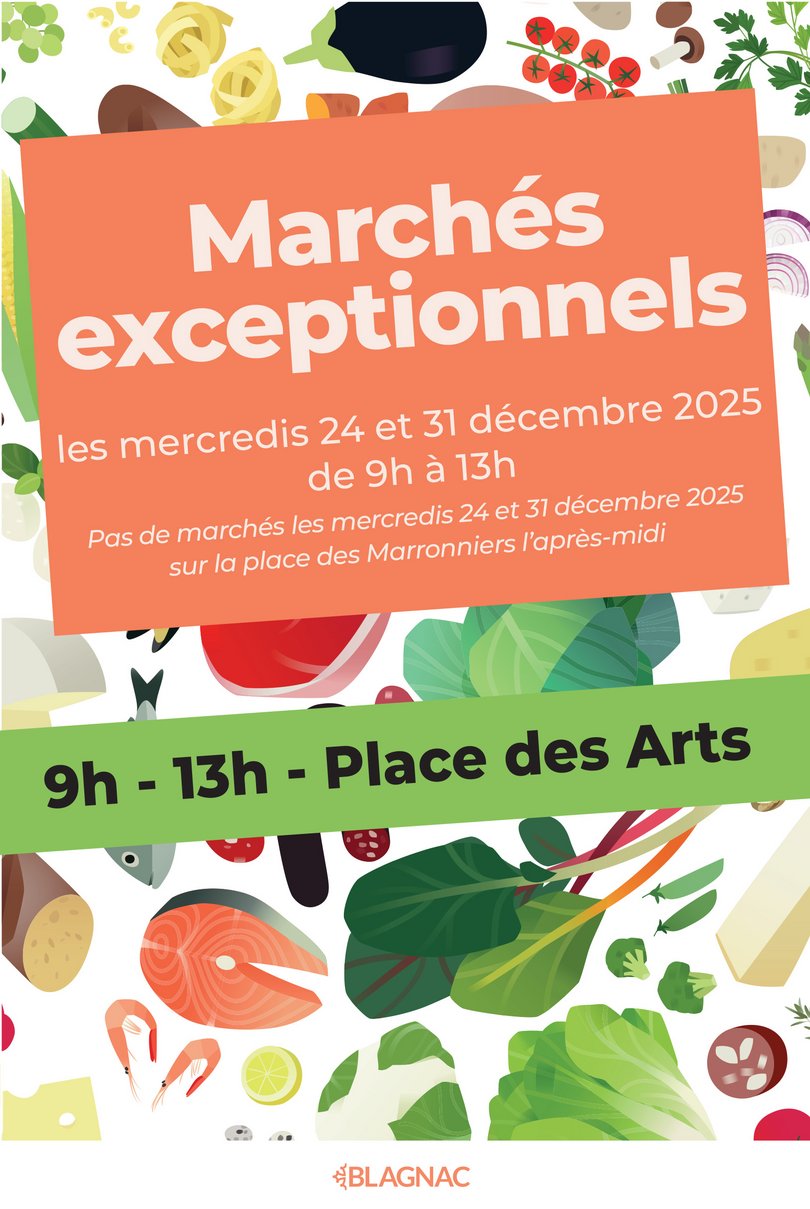 Pas de marchés les mercredis 24 et 31 décembre 2025 sur la place des Marronniers. Ils sont remplacés par 2 marchés exceptionnels les mercredis matins les 24 et 31 décembre de 9h à 13h sur la place des Arts et la place Jean-Louis Puig.