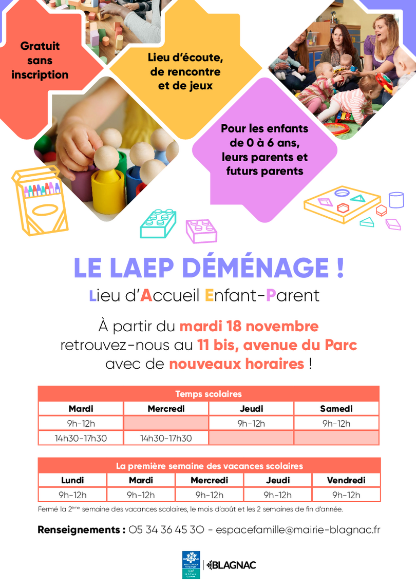 Les LAEP quotidiens changent de lieu et se déplacent à l’Espace Saint Exupéry : 11 bis avenue du Parc.